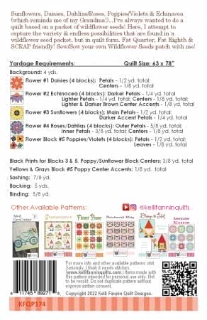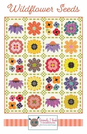 This quilt was designed with an inspiration of the promise and potential of a packet of wildflower seeds. We used a ton of bright tonals from the Suede collection by P&B Textiles. Sunflowers, Daisies, Dahlias/Roses, Poppies/Violets and Echinacia. A garden full of flowers. Sew/Sow your own Wildflower Seeds patch.