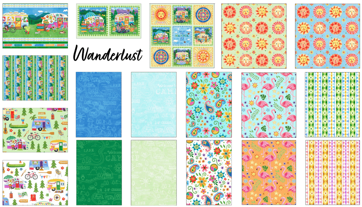 About the Fabric: Not all who wander are lost…clean, clear color combines with terrific artwork in this debut collection from Stephanie Peterson Jones! Who's not ready to hit the road or plan their next trip? These fabrics are simply FUN! So many project possibilities…make a bevy of items for your own camper such as pillows, seat cushions, table cloths, campsite flags! Consider making all sizes & shapes of bags or totes as well. The sun print will make great appliques and the paisley toss will look great in apparel. We're offering several free patterns…a bed quilt and placemats. Also, offering a quilt-in-a-pillow pattern that's perfect for taking with you any time you travel!