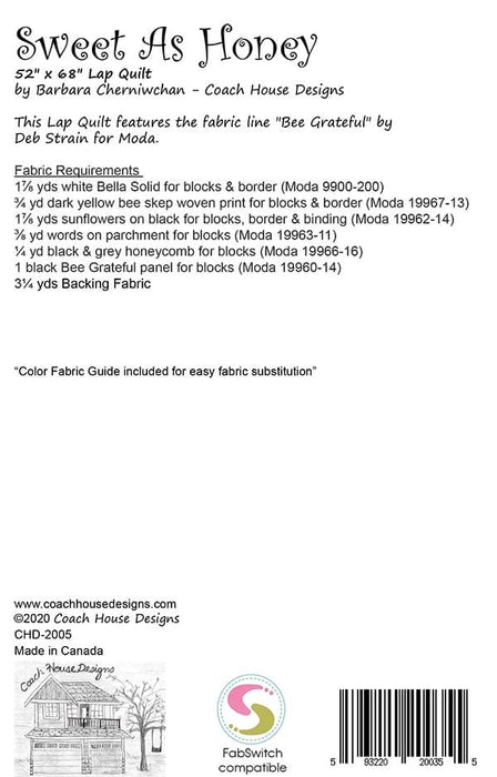 Sweet as Honey - Quilt PATTERN - Barbara Cherniwchan - Coach House Designs - features Bee Grateful Deb Strain - MODA - 52" x 68"