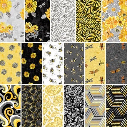 About the Mellow Yellow Fabric Collection: This contemporary floral collection is colored in yellow, grey and black. It includes a large floral design, a packed floral, various geometrics, bees, dragonflies, a paisley and a scroll.