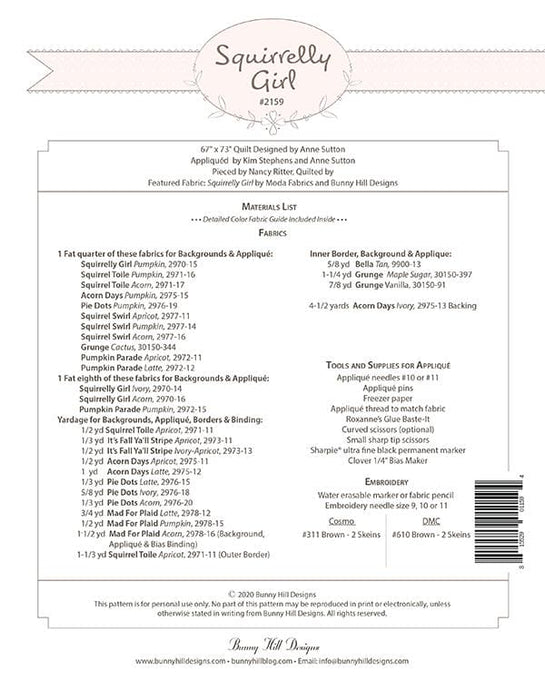 Squirrelly Girl - BOM Quilt Pattern - by Bunny Hill Designs for MODA - uses Squirrelly Girl - #2159