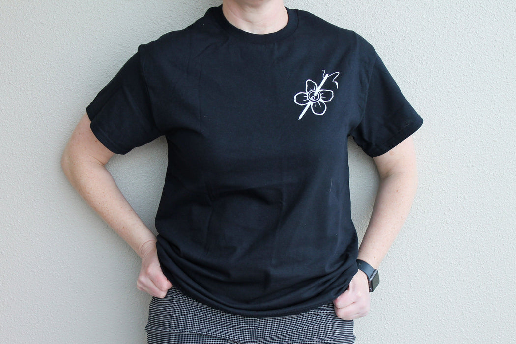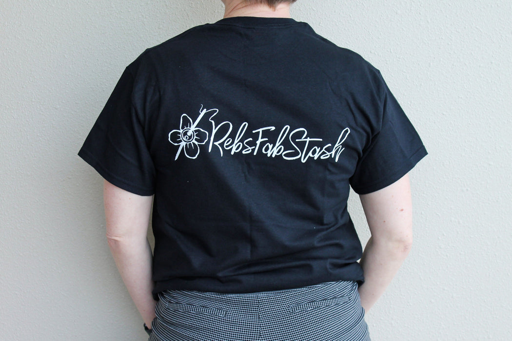 Syringa flower on the front left of t-shirt and full RebsFabStash logo is on the back.