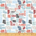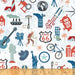 Great images of all your favorite tourist activities and destinations from across the USA! Coordinating reds, blues, light green, and tans on a white background with blue texture. Images are no larger than 3" wide or 4" tall. Approximate 12" repeat.