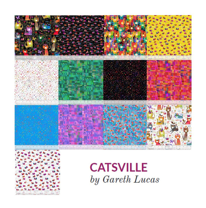 Curious cats, snails on trails, birdies tweeting and prism textures all in technicolor rainbow. Catsville, new from designer Gareth Lucas will delight lovers of color and cats alike!