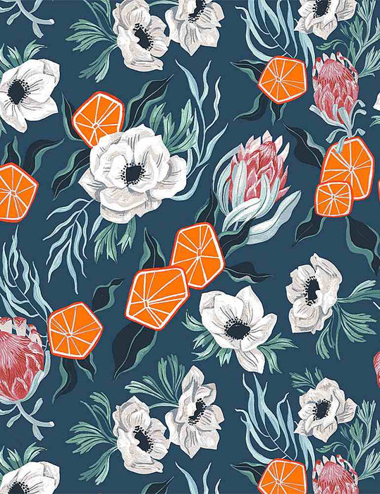 This print features white foxes and winter sprigs on a dark blue background. Fabric is non-directional and has a 10" repeat. Foxes are approximately 1.5" x 3.5" and 2" x 2" in size.