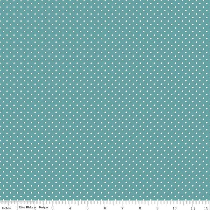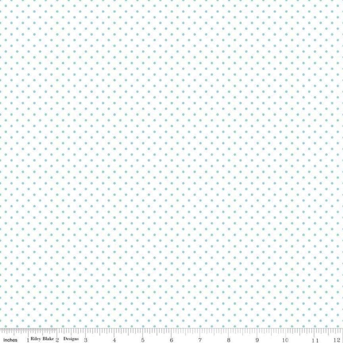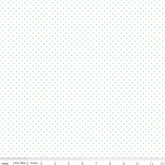 This Riley Blake Designs Basic fabric features aqua polka dots on a lighter cream background every 1/2" along the fabric.