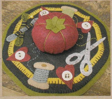 Sewing Mat - A fun sewing themed mat for your pins and needles. Notions surround the mat and a matching tomato pin cushion sits in the middle. Make with wool felts and embroidery stitches.
