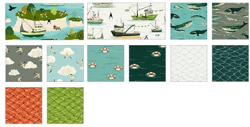 Katherine Quinn's third collection, Land and Sea, embraces far off lands surrounded by vast open ocean. Whales migrate through the sea passing ships and remote islands under bright skies and soaring sea birds. With a palette of bottle green, deep turquoise, storm cloud grey and rusty coral, this nautical collection will really float your boat!