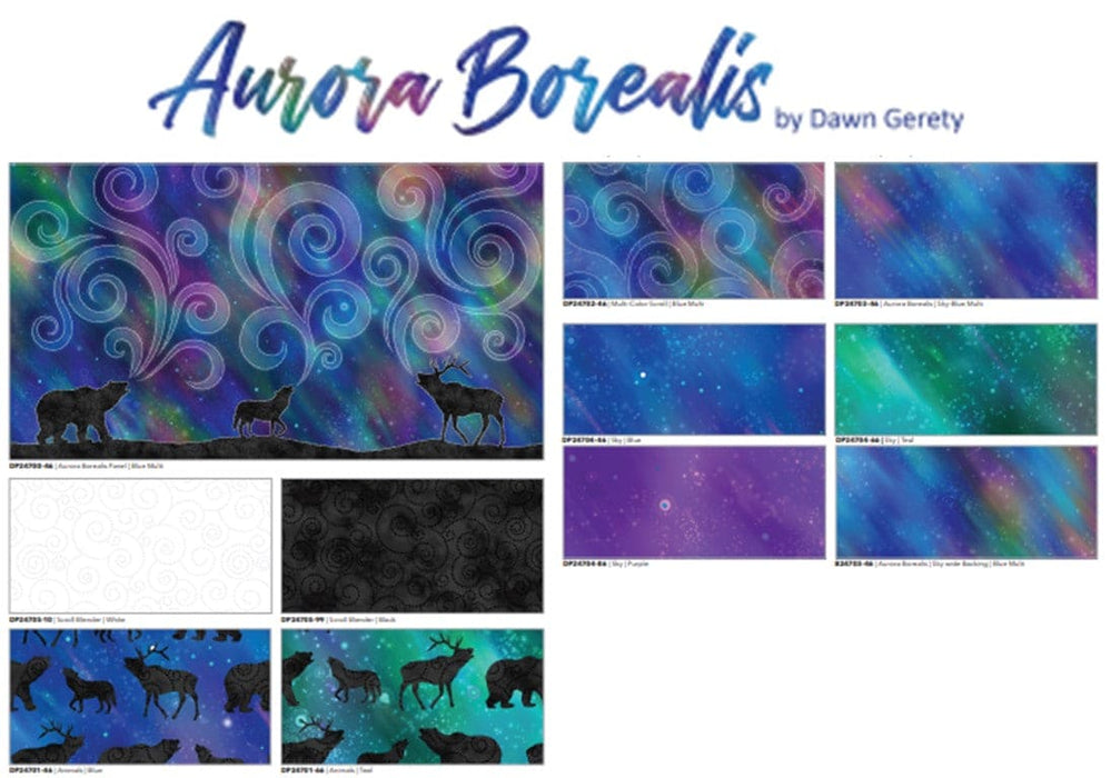 About the Aurora Borealis Fabric Collection: The Aurora Borealis is a spectacular natural light display witnessed around the world, though predominantly in the Arctic and Antarctic. Cascading colors creating shapes associated with fire in the sky and mythical creatures have shaped legendary folklore since ancient times. Created by Alaskan artist Dawn Gerety, Aurora Borealis reflects the beauty of the northern lights in bold color. A shadow play of animals highlighted in the panel and focal prints add contrast to the colorful backdrop. The panel makes an idyllic tryptic wall hanging or featured blocks in a quilt. A selection of unique textural prints reflect the northern lights in a variety of vibrant hues while a selection of Toscana prints complete the coordination. Experience the magic of Aurora Borealis!