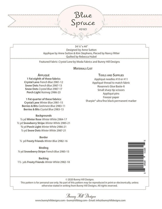 NEW! Blue Spruce - Quilt PATTERN - by Anne Sutton of Bunny Hill Designs - Features Crystal Lane Fabrics- Applique, Pine, Tree - #2165