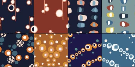 This print features chains of circles in different textures on a dark blue background.