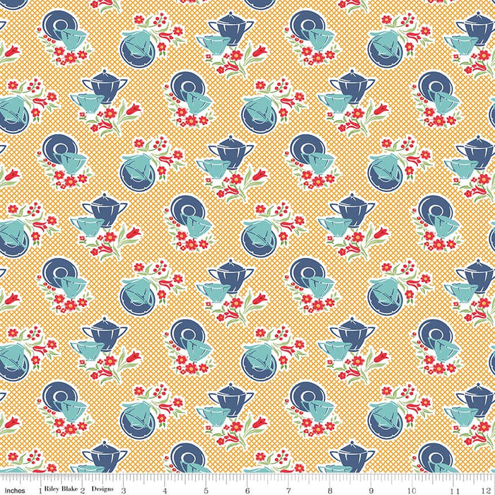 Cook Book by Lori Holt of Bee in my Bonnet for Riley Blake Designs is great for quilting, apparel and home decor. This print features flowers and vintage dishes on a diagonal grid background.