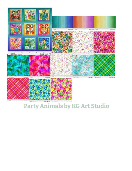 Kim Green of KG Art Studio brings us her newest collection in her whimsical, folk-art style. Tons of color and multiple layers adds to the depth of interest in all her motifs. This theme is pure fun! Do animals party? Hmmm .... we hope so! Use the 12" panel blocks in a quilt, totes, placemats and more! The coordinate prints provide artistic balance but stand on their own just as well. P&B Textiles is offering two complimentary quilt patterns. One shows how the ombre print works as a frame around each of the panel blocks. Stacey Day designed a second quilt with a totally different look!