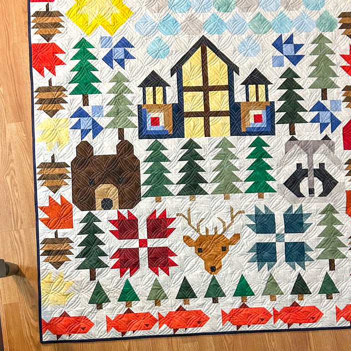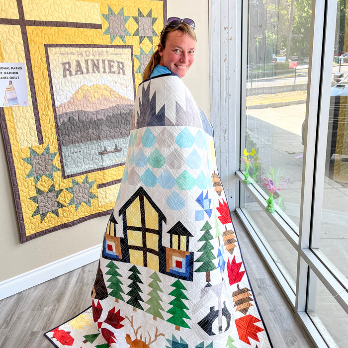 Take a trip around the Northwestern USA without even leaving your sewing room! Bears, salmon, elk, raccoons, evergreens, and even a log cabin, designed after our owner's home!