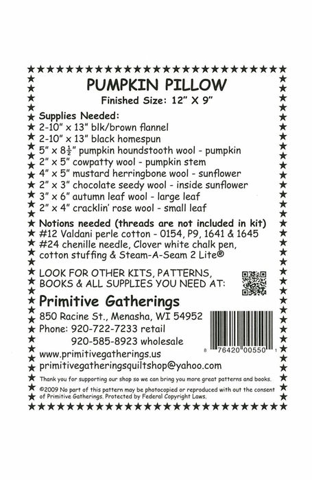 Pumpkin Pillow- Mini pattern- Primitive Gatherings by Lisa Bongean -Primitive, Wool Applique, precut friendly #550