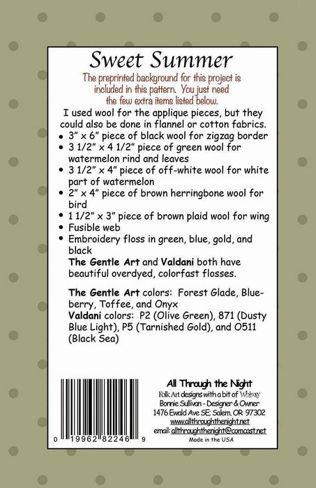 Sweet Summer -July- Preprinted embroidery applique pattern - Bonnie Sullivan-Flannel or Wool-All Through the Night -Primitive, applique
